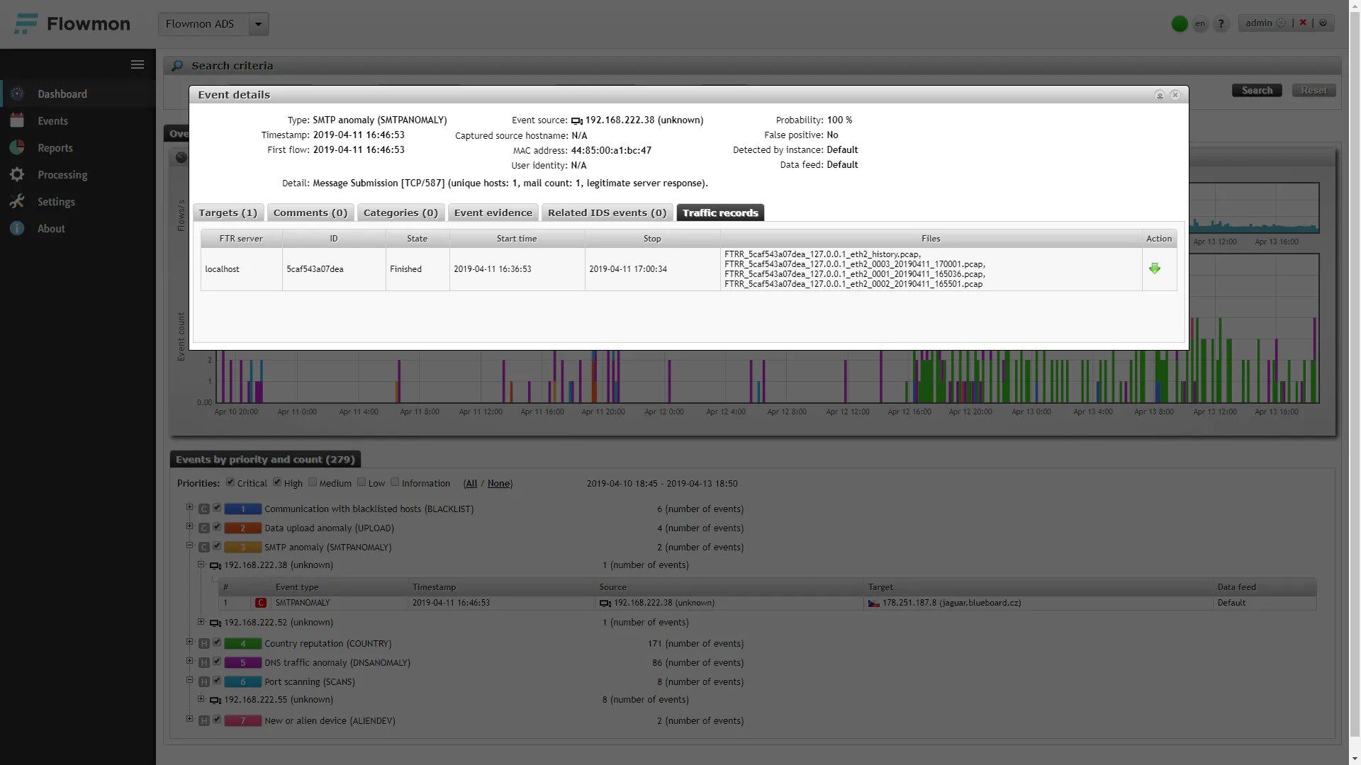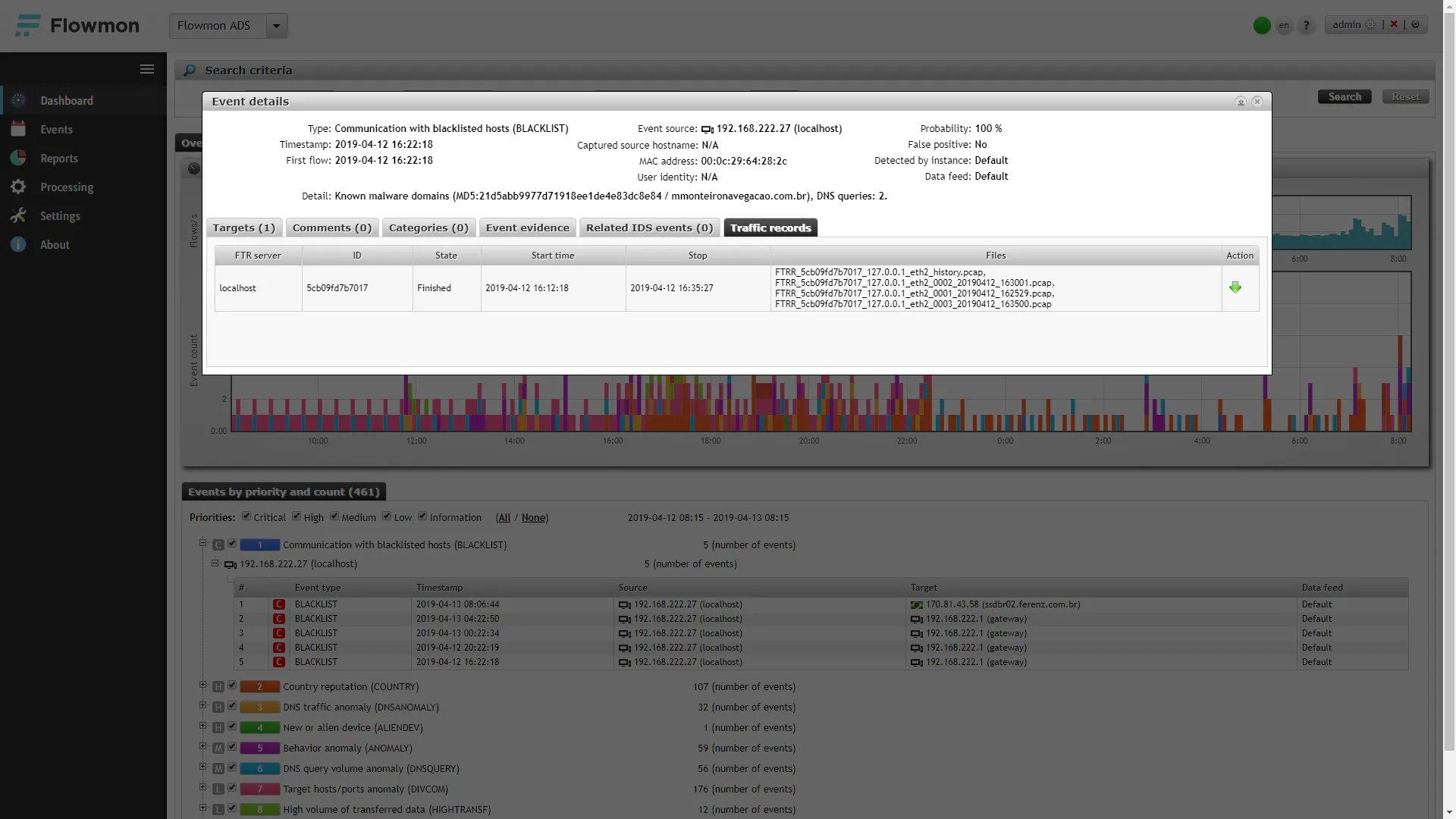 Sometimes we say “PCAP it or it didn’t happen”. So how can I get the packets of my interest as they have already gone and been converted to flows? The solution here is an elastic and intelligent memory buffer configured to keep in memory packets that might be needed to be captured for a limited time frame. The feature we are talking about is a rolling memory buffer introduced in Flowmon Traffic Recorder 10.0, combined with the triggered capture capability of Flowmon ADS. Let’s demonstrate the principle of the operation by using a simple scenario. I have detected and reported communication with a compromised site using Flowmon ADS. As part of the detection I have event details provided by Flowmon ADS, flow data from Flowmon Collector and full packet traces collected using Flowmon Traffic Recorder. Everything out of the box and collected automatically. One of the PCAP files is the “history” file that contains packets from the memory buffer of corresponding flow data that triggered the detection.
