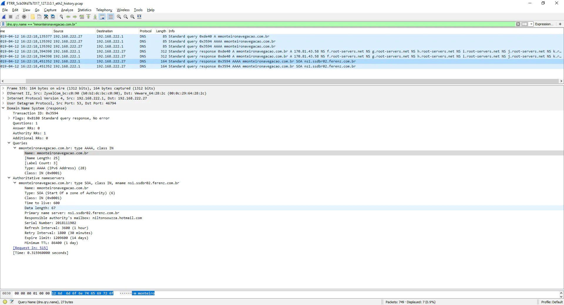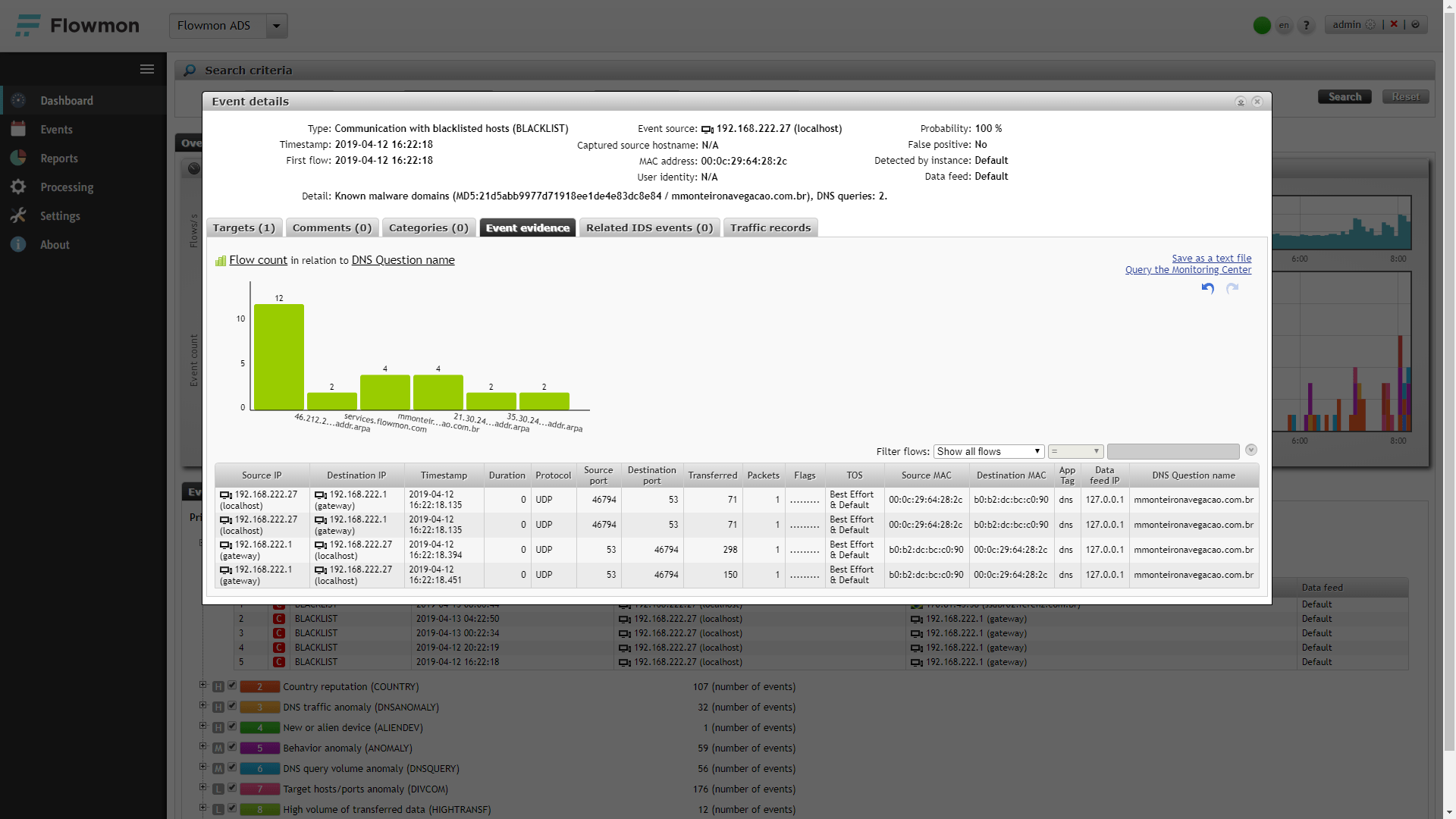 Figure 1 Event details showing a detected and reported DNS query to a malicious domain and providing flow data as event evidence. The device with IP address 192.168.222.27 asks for a DNS translation of a known domain related to malware distribution “mmonteironavegacao.com.br” using the DNS server 192.168.222.1.