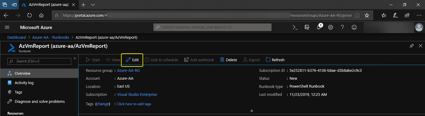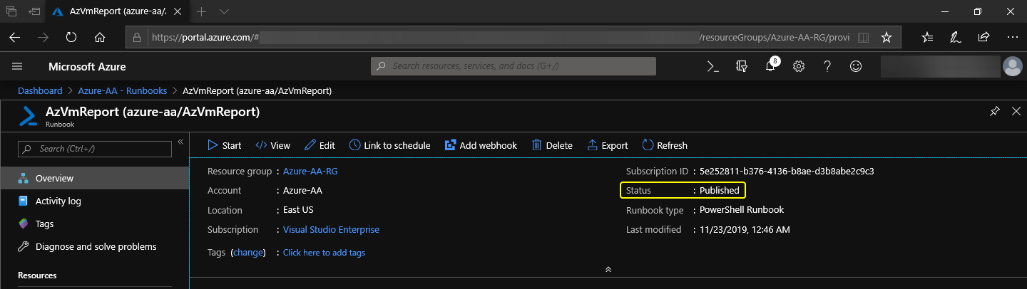 Now that the runbook is published, you can either wait for the schedule to run or you can manually trigger runbook execution using the Portal or PowerShell.