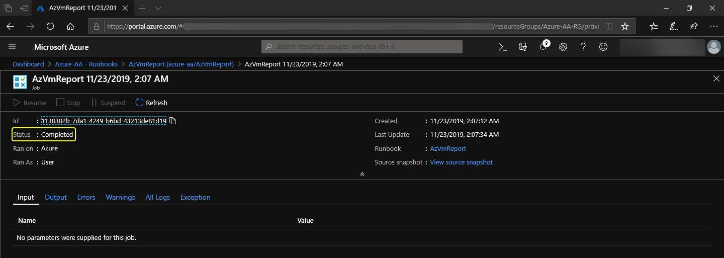 This is where the runbook job logs come in handy. Checking the logs can give you an idea of what happened with the runbook execution and possibly help you in troubleshooting.