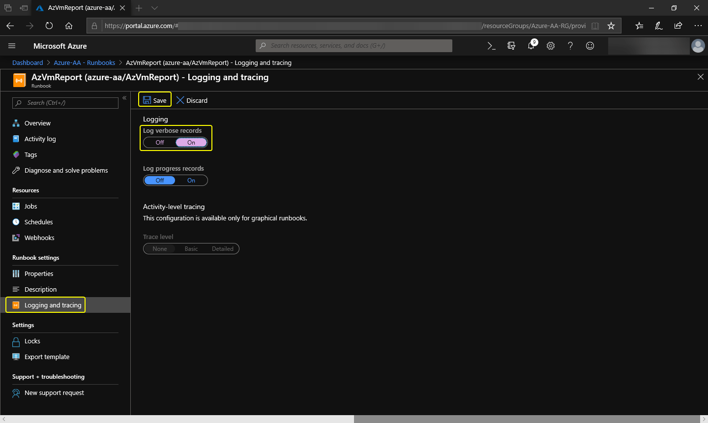 To enable verbose logging for the runbook using the Portal, navigate to the runbook and under the Runbook settings section, click on Logging and tracing. Then toggle the Log verbose record switch to On. Click Save.