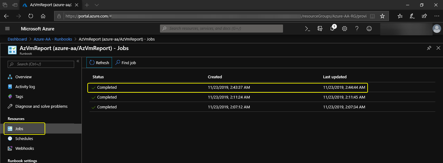 To check the logs, navigate to the runbook and under the Resources section, click on Jobs. Then select the job you’d like to view from the list.