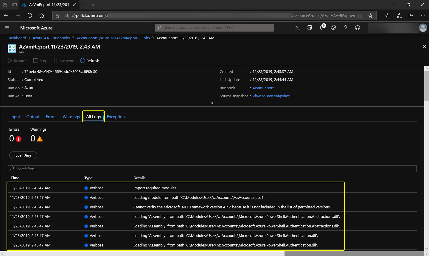 This brings you to the Job where you can view all the available logs like Errors, Warnings and Verbose records. Next click on All Logs to view the log entries including the verbose messages.