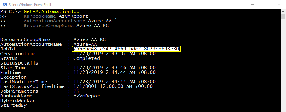 To check the logs using PowerShell, first, find the Id of the Job to inspect using this command below.