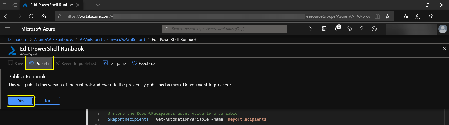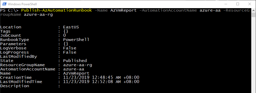 The code above will publish the automation runbook AzVmReport using the Azure-AA automation account that belongs to the Azure-AA-RG resource group.