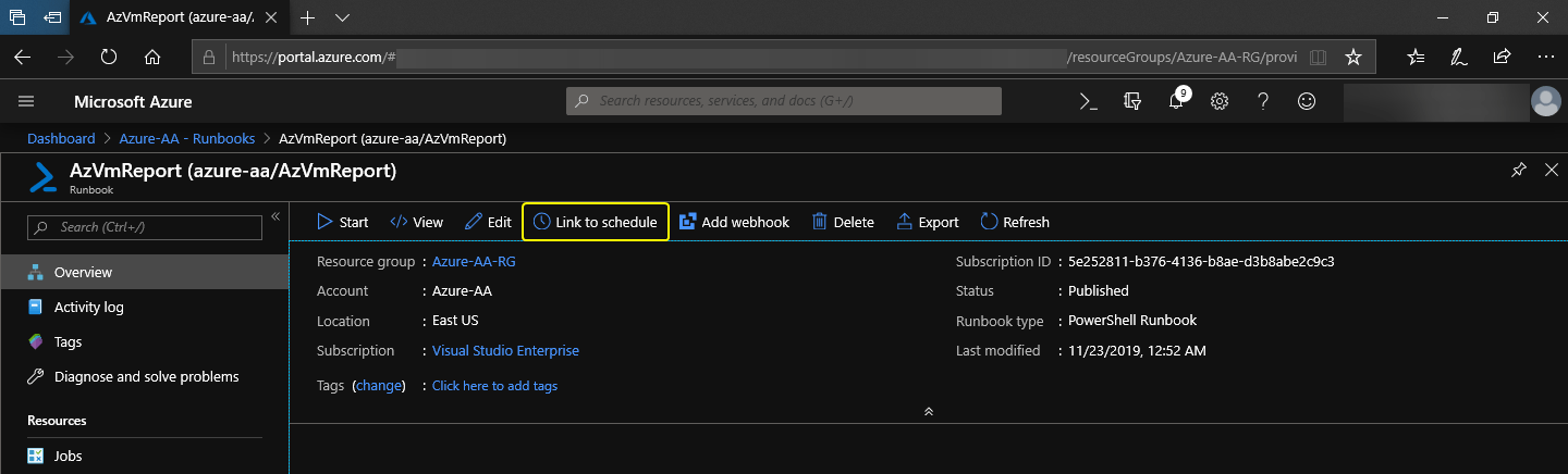 To link the runbook to a schedule, navigate to the runbook and click on Link to schedule.