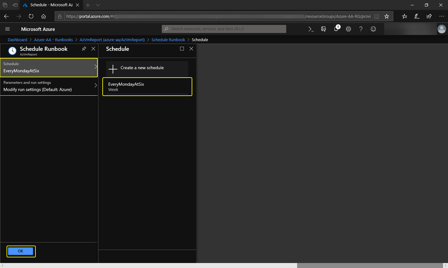 Next, click on Link a schedule to your runbook and select the name of the schedule that was previously created. The schedule name is EveryMondayAtSix. Then click on OK.