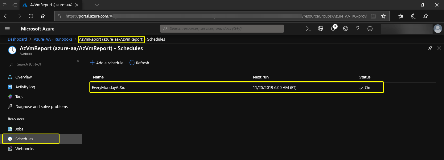 When completed, you can check that the schedule is linked by doing to the Schedules page of the runbook and see of the schedule is listed.