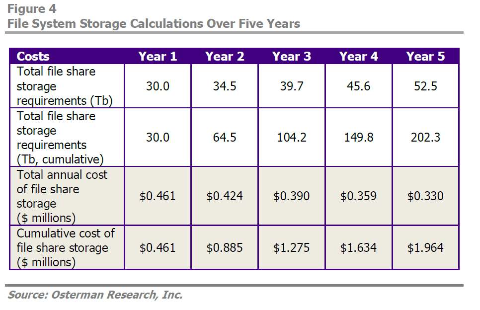In figure 4 in the report, we can see the total annual costs of file share storage has been going down. However, this is countered by the cumulation of data on that storage. So the costs for managing and storing that data goes up over time.