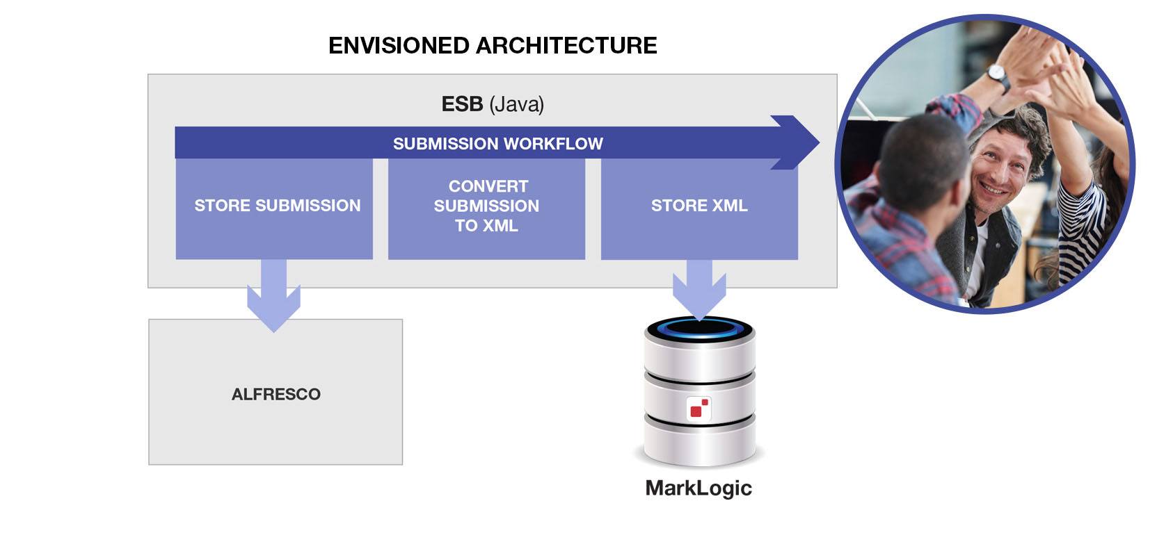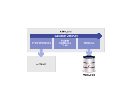 “MarkLogic is the best XML/JSON document store in the world – we get that! But binaries should go into a ‘content system.’ A CMS or DAM. Let’s use Alfresco to store the Excel and some generated PDF notices, and put the XML in MarkLogic – that way we use a best-of-breed system for each type of data!”