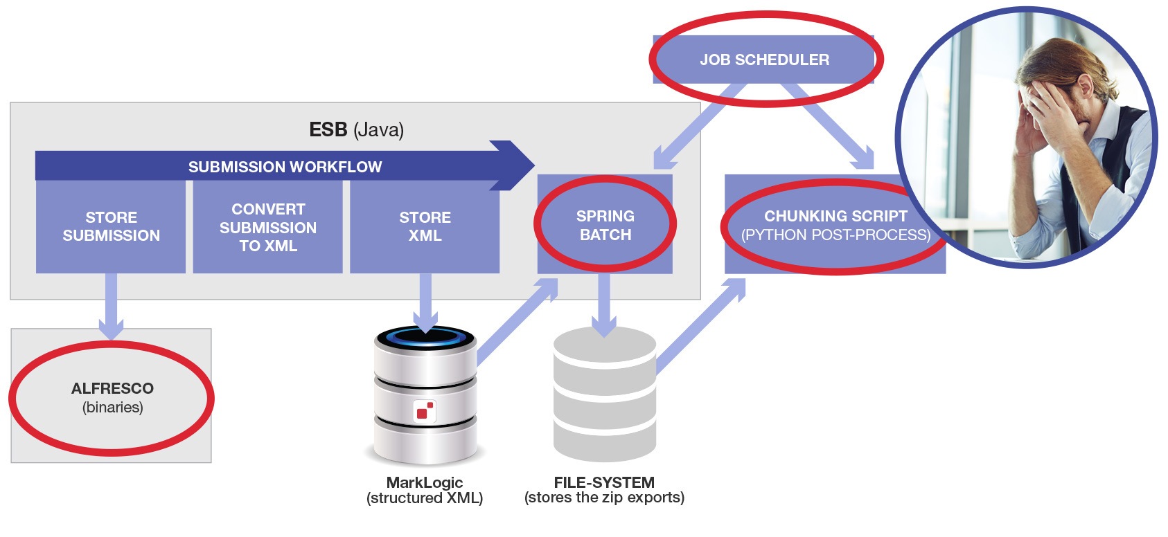 But wait, there’s more… The first Spring Batch process has to complete before the external python chunking script runs. So we need to connect both to a job scheduler (they used an enterprise Job Control product, but a cron job would do as well). Here is a diagram showing the additional components added to the overall architecture (new items circled in red):
