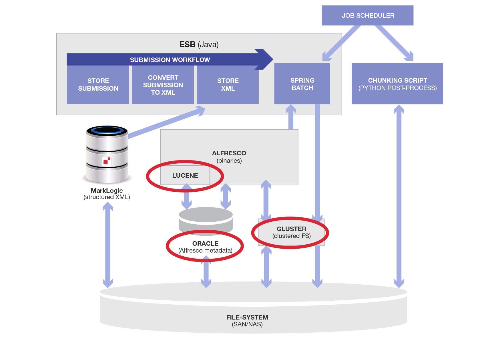 Alfresco uses two different stores, and does not manage transactions in them, much less XA transactions with other sub-systems; a relational database for some bookkeeping data and a file system for the actual binaries (because BLOBs don’t work well). For the file-system to be reliable we need a clustered, highly-available file-system like GlusterFS. Alfresco internally bundles a number of separate internal components with a core cobbled together from a relational database adapter and an internal build of Lucene for text indexing, plus direct file-system access. Here is an updated diagram with the internal physical and software components introduced by Alfresco: