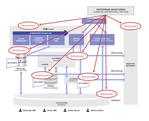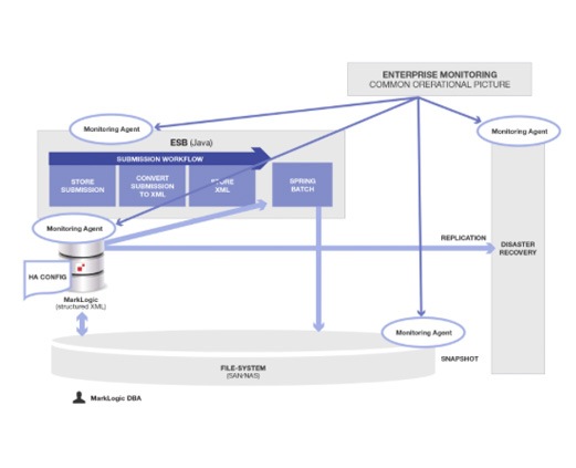 Again, here is a diagram with red circles to show the added monitoring agents that must be developed, maintained and integrated to keep all this stuff working that should not have been necessary. The Enterprise Monitoring product and MarkLogic agent are not circled, because they were going to be necessary even if the data was all stored in MarkLogic, as it should have been.