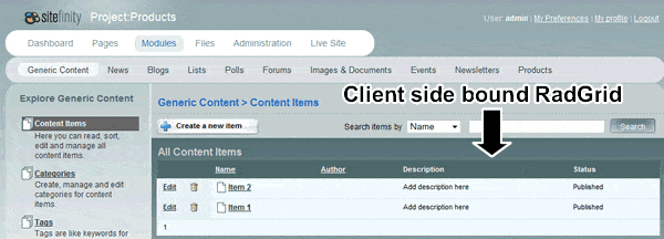 When we are talking about client side data binding for Generic Content based modules, we are talking about the RadGrid control which lists all the content items of a given module.