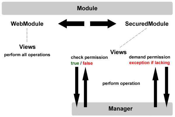Every module can inherit from WebModule or SecuredModule class. If module inherits from WebModule class, all users will be able to perform all operations. If module, however, inherits from SecuredModule class - we will have ability to access following two methods of the security API: