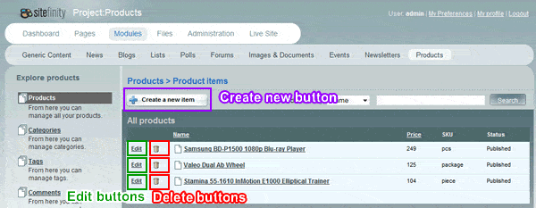 If you are unsure which Views are using permissions, you can simply try to override CheckPermission and DemandPermission in all Views - we have strictly followed this naming convention. For example, on the ProductsItemListView we have buttons for Creating new product, Editing existing product and Deleting a product. Since our products module is a secured module, we should check if currently logged in user has permissions to create new product, edit existing product and delete product and set up the user interface accordingly.