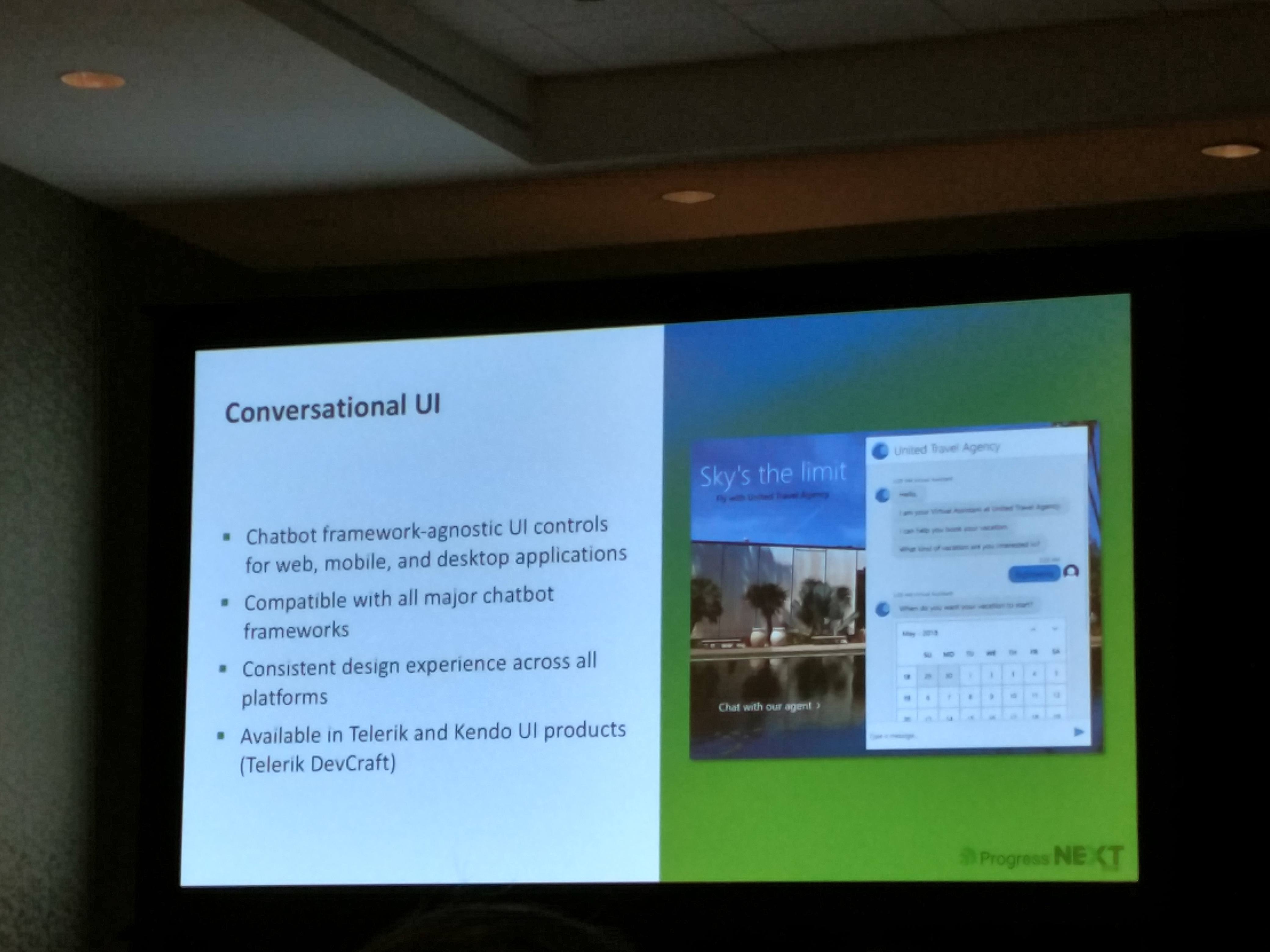 One of the big pieces of news from the Telerik R2 2018 breakout was the Conversational UI that is coming across our Telerik line of developer tools (as you can see in the slide above), which is really exciting - it's an industry first. A new beta of Telerik UI for AR/VR was displayed too. There were also important reminders about the versatility of Xamarin for mobile, the strength of ASP.NET Core, and the latest improvements in our leading desktop and reporting tools.