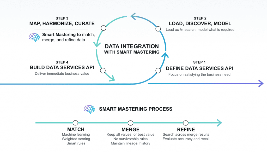 To better understand how Smart Mastering works, let’s walk through how it works at a high level. First of all, it’s important to understand that Smart Mastering is just one significant step on the data integration journey towards creating a 360 view.