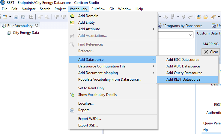 To save time, I’m going to use Corticon’s vocabulary generation accelerator to create my vocabulary based on the relational representation of the endpoint. That way, all of my vocabulary’s entities and attributes will be automatically mapped to populate with live data from the REST endpoint for each decision service request.