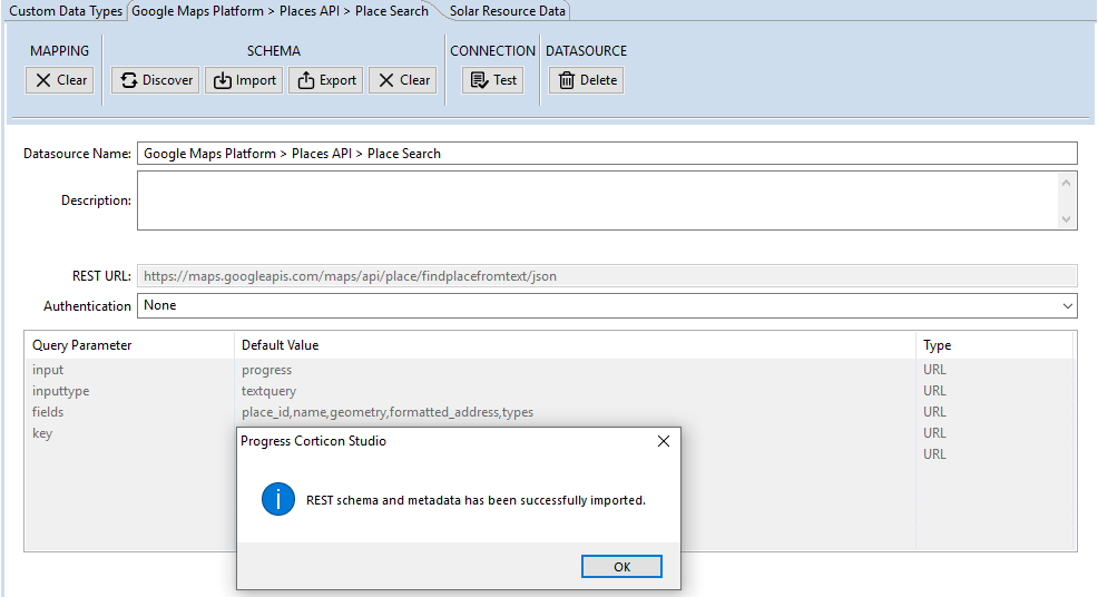 I’m going to copy the base URL for my first REST call into the “REST URL” field. This request will retrieve information about Progress from Google Maps.