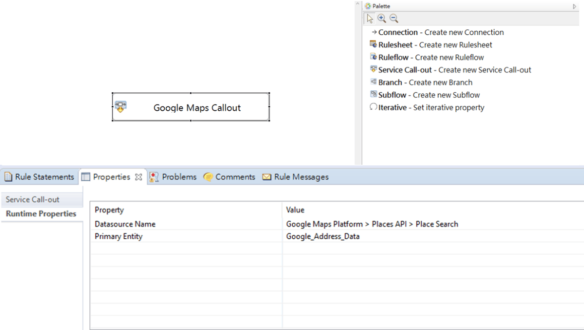 Before I model rules, I’ll create a new Rule Flow, and add a Service Callout to my Rule Flow’s canvas and select the REST endpoint from the runtime properties dropdown.