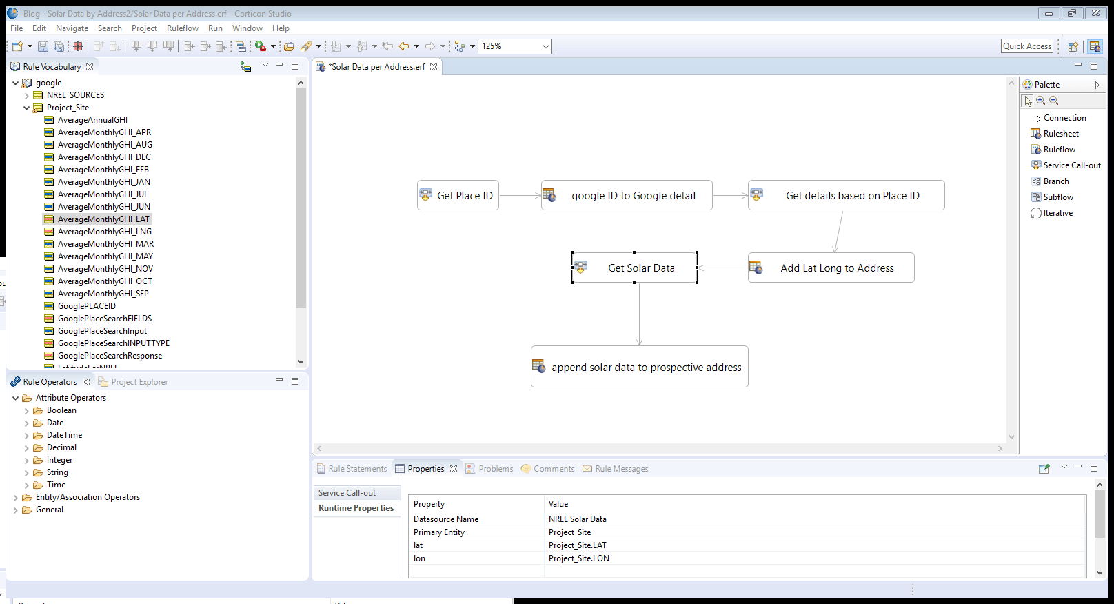 I don’t need to manually create or map my rule vocabulary to the data structure of these REST endpoints, I can use the vocabulary generation tool for this. This way, Corticon will also auto-generate the ‘join’ expressions that define the queries to the REST service. Even after connecting to and defining connections between my Rule Vocabulary and three different REST services, I only need two different entities in my vocabulary. At runtime, Corticon will go out and retrieve the data that corresponds to each of the attributes under the entities (Project_Site and NREL_SOURCES) from their respective datasources. With my vocabulary created and mapped, I’ll create a Rule Flow that will organize my REST calls, and add in a few rules to document the data being populated from these external services.