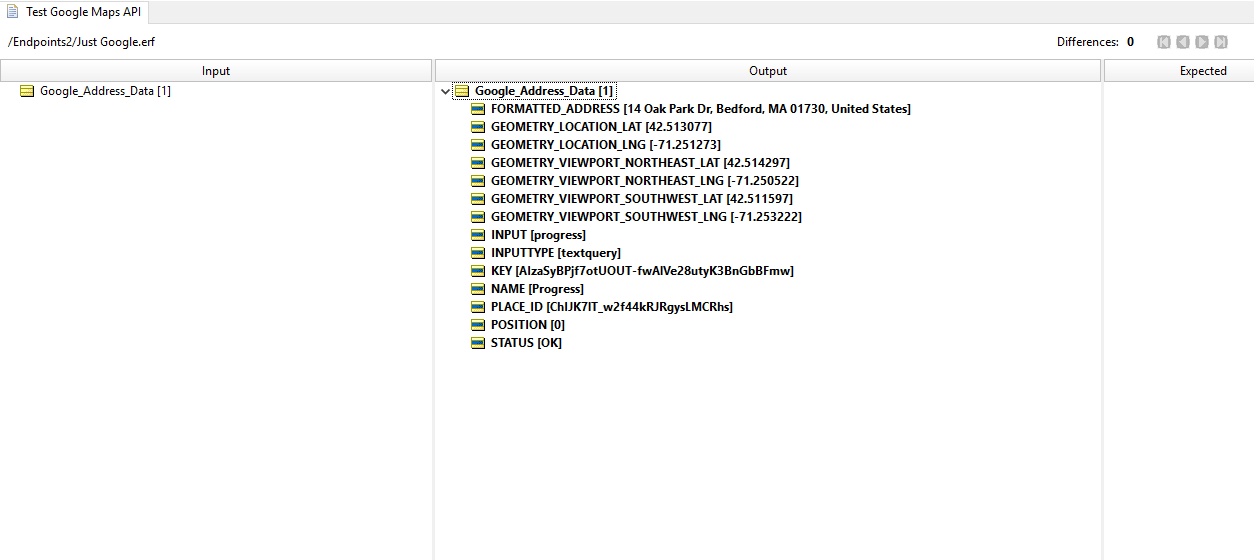 This checks out. The only data I needed to start with was the ‘input’ field for the Google Maps API request. Think of it like typing into the Google Maps search bar—even though Progress has offices around the world, Google doesn’t need more than my input of Progress Software Bedford.