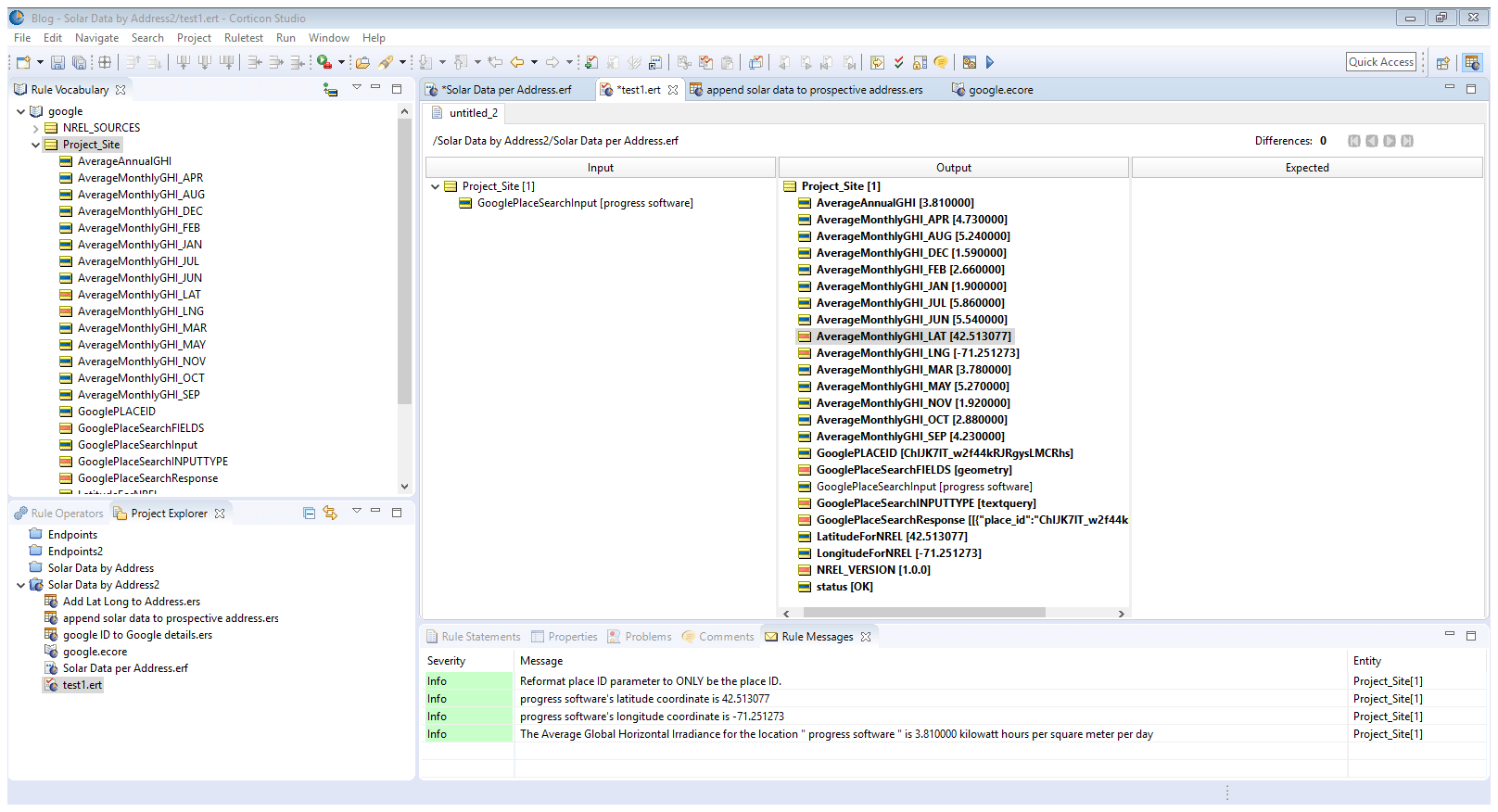It worked! As shown in the left ‘input’ column, the only data I provided in my Rule Test was my GooglePlaceSearchInput of “progress software.” This alone was enough to identify the site with a placeID, use the placeID to get the coordinates of the site, and then use those coordinates to retrieve the average global horizontal irradiance value for those coordinates by month and annually.