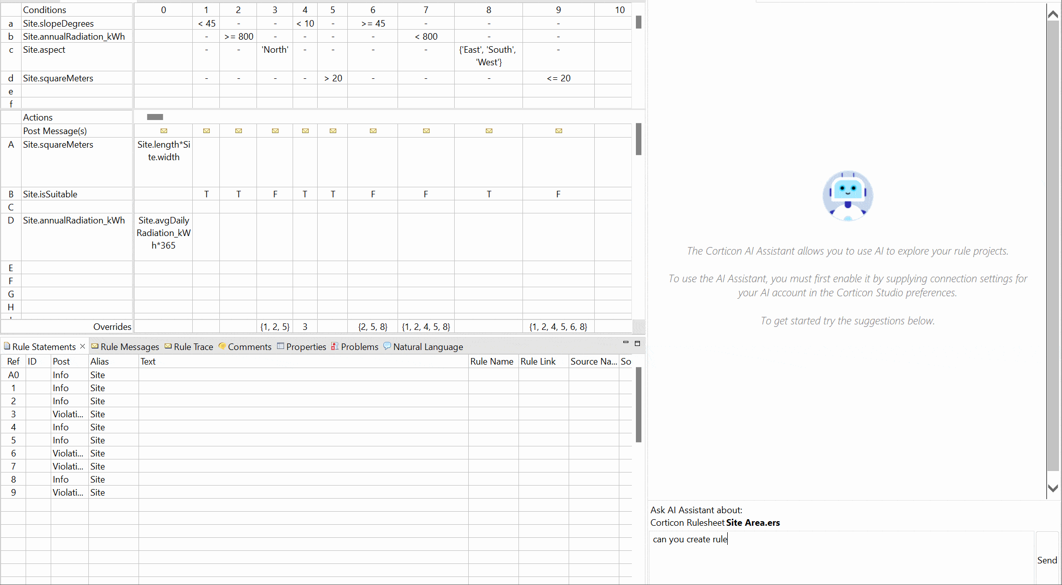 For example, in the screenshot below, the AI Assistant evaluates the rules in a rulesheet which implements rules to evaluate the suitability of a given rooftop for solar panel installation.