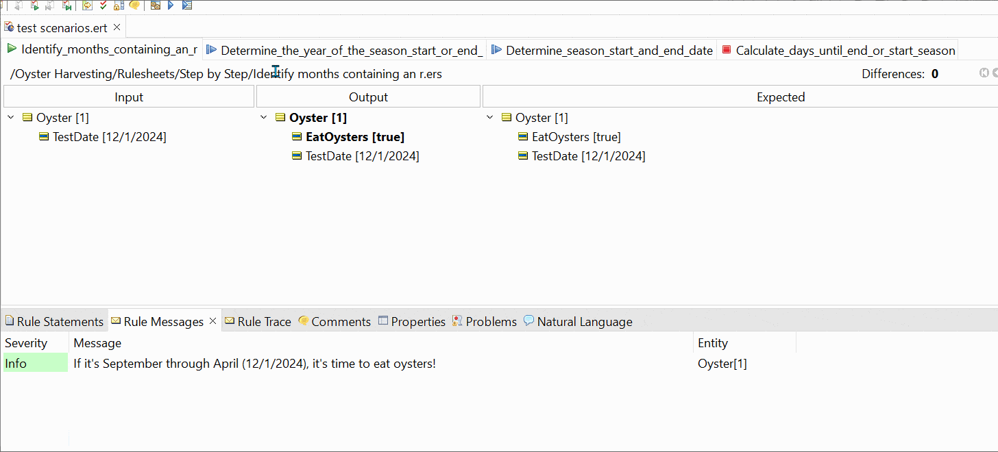 With Corticon’s new rule test generator, rule modelers can generate a ruletest against a ruleflow, made up of distinct testsheets for each rulesheet in that ruleflow, as shown in the following example built with the rules in the Oyster-Eating Season sample available from our GitHub.