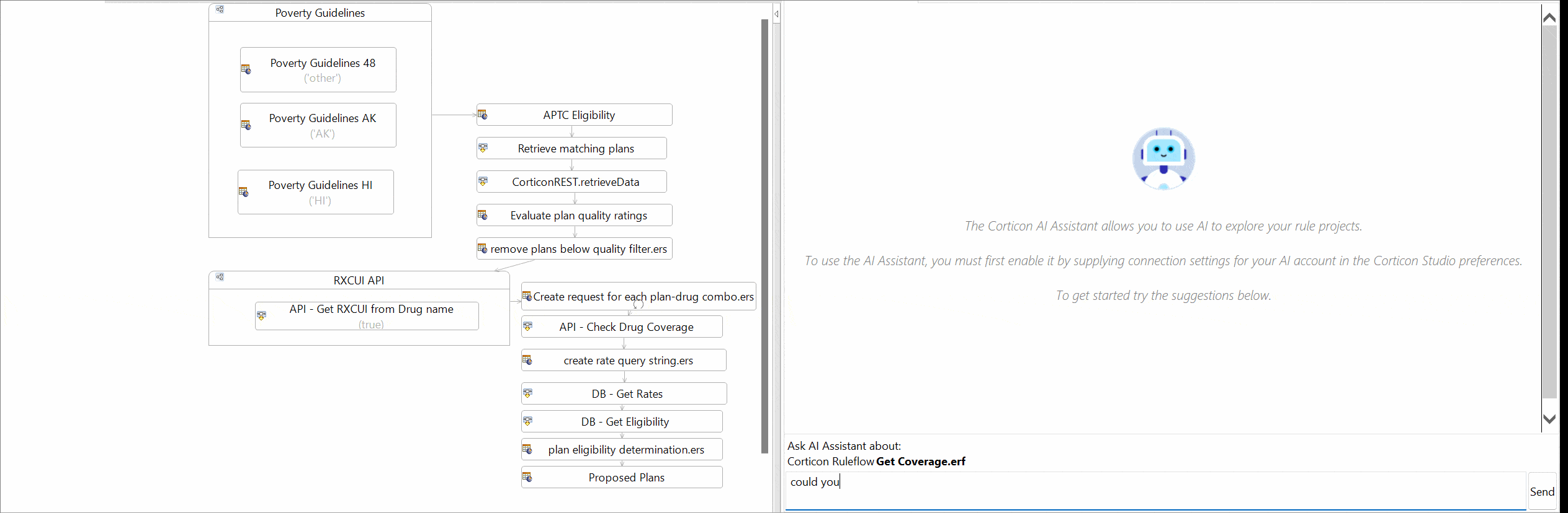 Now, using the AI Assistant, rule modelers can ask for test cases tailor made for their rule assets and its rule vocabulary. In the recording below, the AI assistant analyzes an extensive ruleflow which implements rules for the US affordable care act marketplace, healthcare.gov. Based upon the conditions and actions assigned throughout the many rulesheets, the AI assistant can determine which test cases will provide complete coverage of potential scenarios that may be encountered in production.