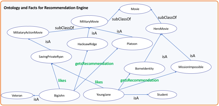 PREFIX rdf: <http://www.w3.org/1999/02/22-rdf-syntax-ns#> PREFIX rdfs: <http://www.w3.org/2000/01/rdf-schema#> PREFIX owl: <http://www.w3.org/2002/07/owl#> PREFIX rec: <http://semantics-rec.com/facts#> INSERT DATA { rec:BigJohn rdf:type rec:Veteran . rec:YoungJane rdf:type rec:Student . rec:SavingPrivateRyan rdf:type rec:MilitaryActionMovie . rec:Platoon rdf:type rec:MilitaryMovie . rec:HacksawRidge rdf:type rec:MilitaryMovie . rec:BourneIdentity rdf:type rec:HeroMovie . rec:MissionImpossibleRogueNation rdf:type rec:HeroMovie . rec:BigJohn rec:likes rec:SavingPrivateRyan . rec:YoungJane rec:likes rec:SavingPrivateRyan }