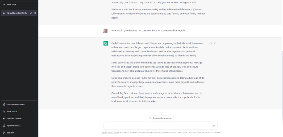 In return, I get back a summary of the different types of people that use PayPal and the advantages for each use case: