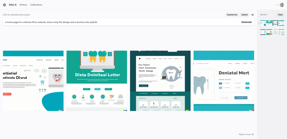 The AI extracted certain details from my request and used them to parse together four images. Each is a partial homepage design, done in a flat style, and includes tooth icons.