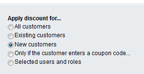 Also, discounts can be restricted to a specific list of customers. The discount can be applied to all customers, existing customers, new customers, customers using a coupon code or to customer in selected users or roles.