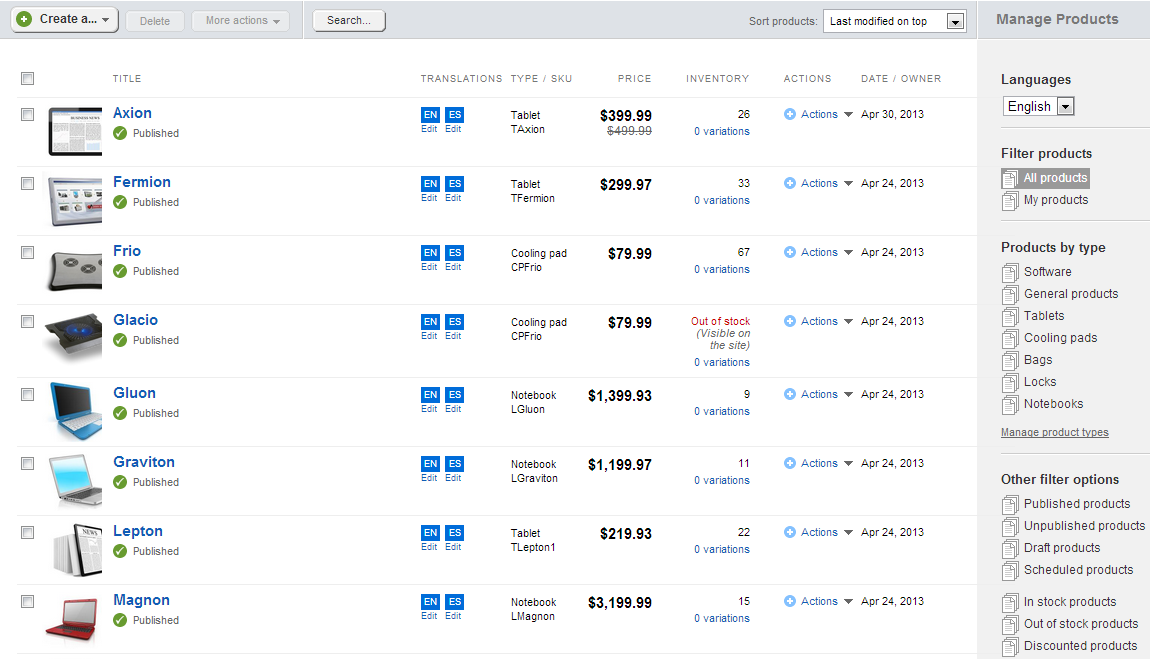 Products now have life cycle similar to Sitefinity content items. Modes are draft, published and unpublished. A product can be created in draft mode and changed to published mode. Once they are published a product can be changed to unpublished and the best of all is a product can now be published and unpublished on a specific date and time.