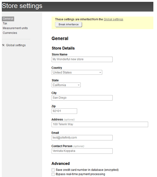 Store settings are now inherited from the Global settings including General store settings, Display for taxes, Measurement Units and Currencies. For multisite implementations you can break the inheritance and have all of the ecommerce settings for each site that you create in your multisite environment.