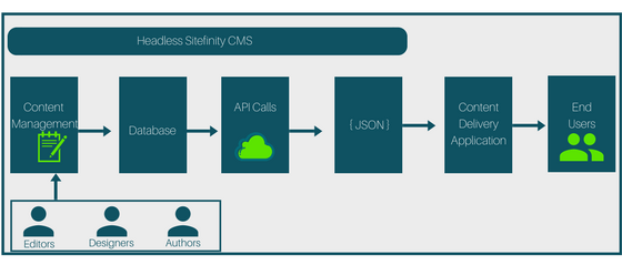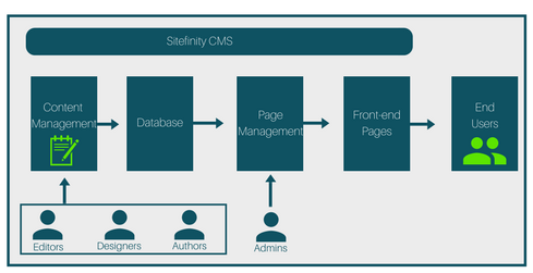 As seen in the below image, the traditional Sitefinity CMS has the Editors, Designers or Authors, which add Content through the CMS’s Admin panel. This content is saved in the Database and is used in the pages, again throughout it. When these pages are approved for publishing by an admin user, they are visible for the end users as frontend pages.