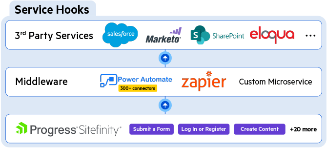 Whenever an event takes place, a service hook will relay the outcome to a proprietary microservice or middleware of choice. The said middleware can be a low-code development platform such as Power Automate or Zapier. Power Automate alone has a set of over 300 connectors—that’s three hundred third-party software solutions Sitefinity can integrate with.