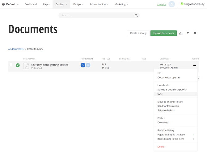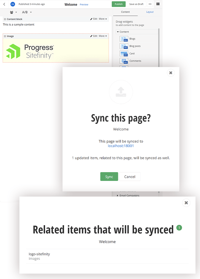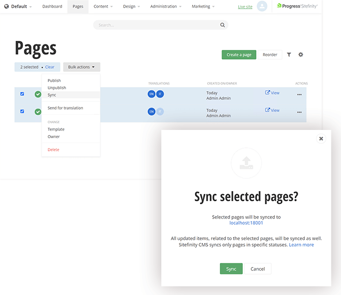 We know marketers are usually busy creating fresh content to keep visitors engaged and informed. Oftentimes, content editors do need to sync multiple pages and content items at once. Operational efficiency? SiteSync delivers. With Sitefinity DX 14.0, content editors can sync items of any given type of content in bulk, regardless of their status.