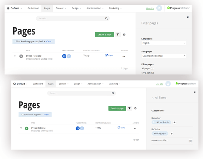 In the ocean of content, it's challenging to determine what’s new and waiting for promotion. Sitefinity DX 14.0 addresses that by providing a new filtering option for all the items awaiting sync.