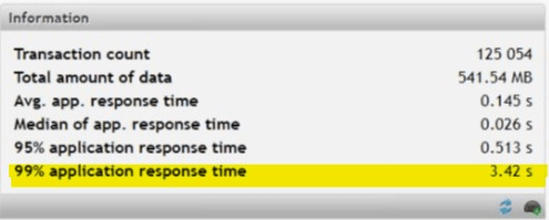 Within a mere 20 minutes of measurement, the problem had already become clear. The 99th percentile response time showed a 3.42-second delay, which means that in 1 % of all user transactions it took the application server to process the request 3.42 seconds or longer. The data also showed that this involved one specific query; i.e. one particular component of the application.