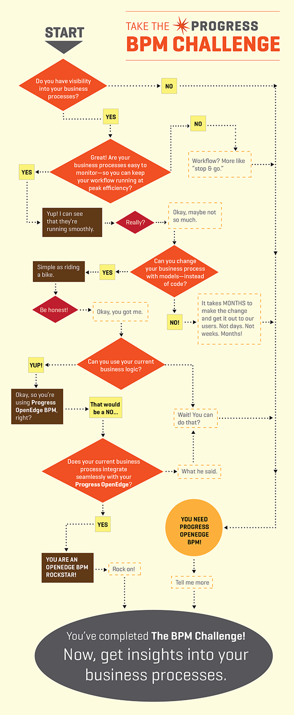 Do you have visibility into your business processes? Are your business processes easy to monitor, so you can keep your workflow running smoothly? Can you change your business processes with models instead of code? Ask yourself these questions and more, when you take the Progress BPM Challenge in the infographic below!