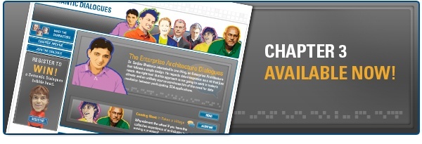 Chapter 3 of The Semantic Dialogues, The Enterprise Architecture Dialogues, is available now. Here's an excerpt: "Sanjay believes that enterprise architecture is the solution, and he takes a hard line on forcing it into the enterprise. In his view, all they need to do is complete the architecture with a data strategy. But Jerry convinces him to see things from the business users' perspective, and proposes some radical changes to the way they use applications. Mick sees an opportunity to make the business happy and fix IT's reputation. Are they all drinking Kool-aid?"