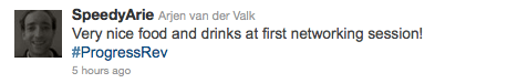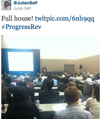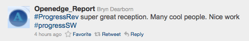 Another great success for day one was the evening reception. Our valuable sponsors, partners, customers and employees gathered for delicious food and drinks, mingled with industry peers and watched product demos from over 30 booths. Our Social Media Booth, #34, also saw quite some buzz as people came to view and contribute to the live stream of the #ProgressRev hashtag and to earn Twitter stamps for their Revolution Passports.