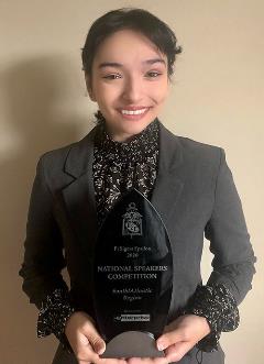 In the first round, Jess had to submit a video of less than five minutes of herself as a CEO addressing shareholders about an important matter with the company. She achieved the highest score in the preliminary round and moved to the finals. In the final round, she had to address the same situation on a live Zoom meeting in front of other competitors, family, friends, judges and Pi Sigma Epsilon officials.