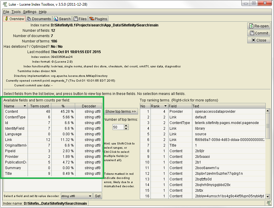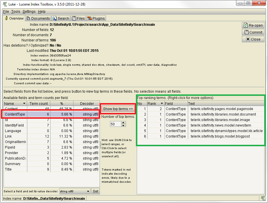 The bottom right table shows the top terms for the whole index, or just for a particular field. For instance, if you select the ContentType field and click "Show top terms >>", you will see the number of document indexed per type (e.g. telerik.sitefinity.pages.model.pagenode represents the number of Pages being indexed):