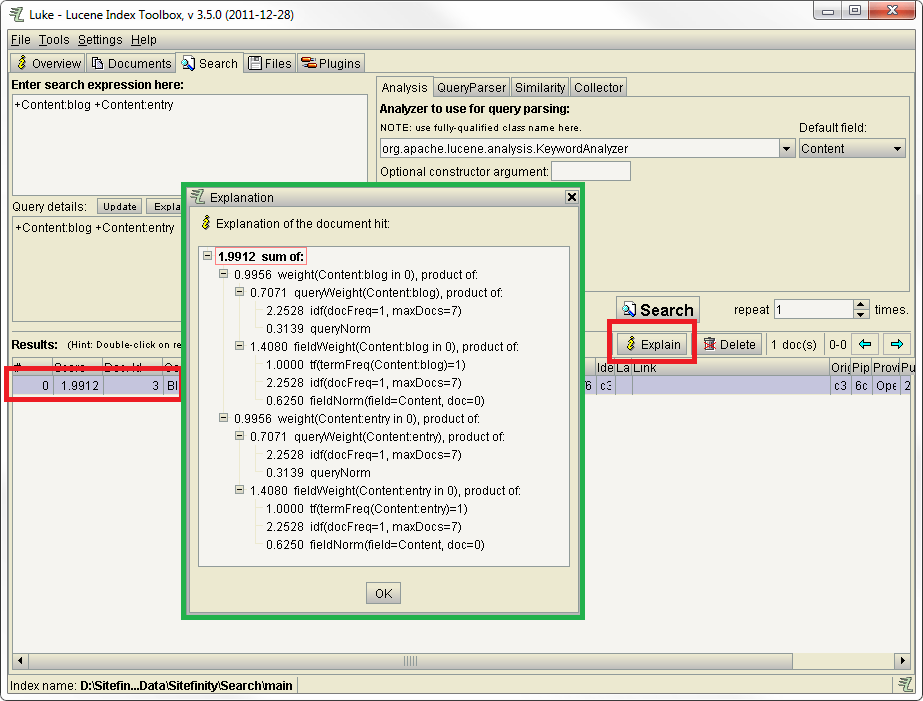 Nonetheless, Luke can help you understand the rationale behind a particular ranking. In the Search tab, select a result and click on the Explain button.