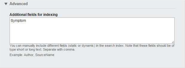 By default, Sitefinity is looking at only two fields when performing a search: Title and Content. You can however index and search in extra fields. In the example below, we add "Symptom" (a field added to a dynamic module) by editing the index and adding the field name under "Additional fields for indexing" in the Advanced section: