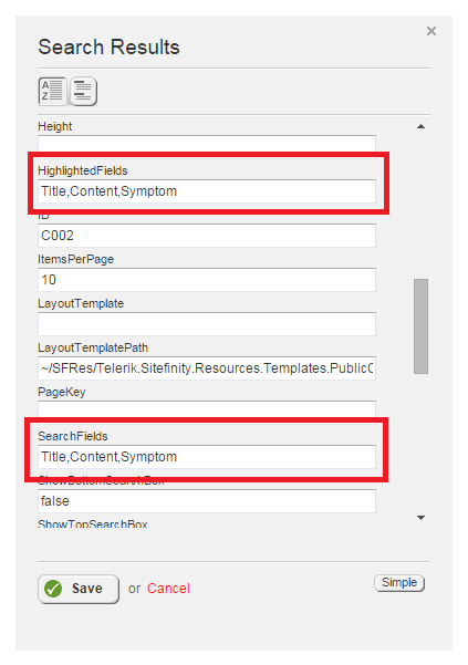 The last step is to update the Search Results widget (in the Advanced properties) to both search for the Symptom field and to highlight any keyword found in that field: